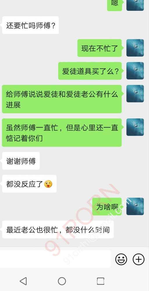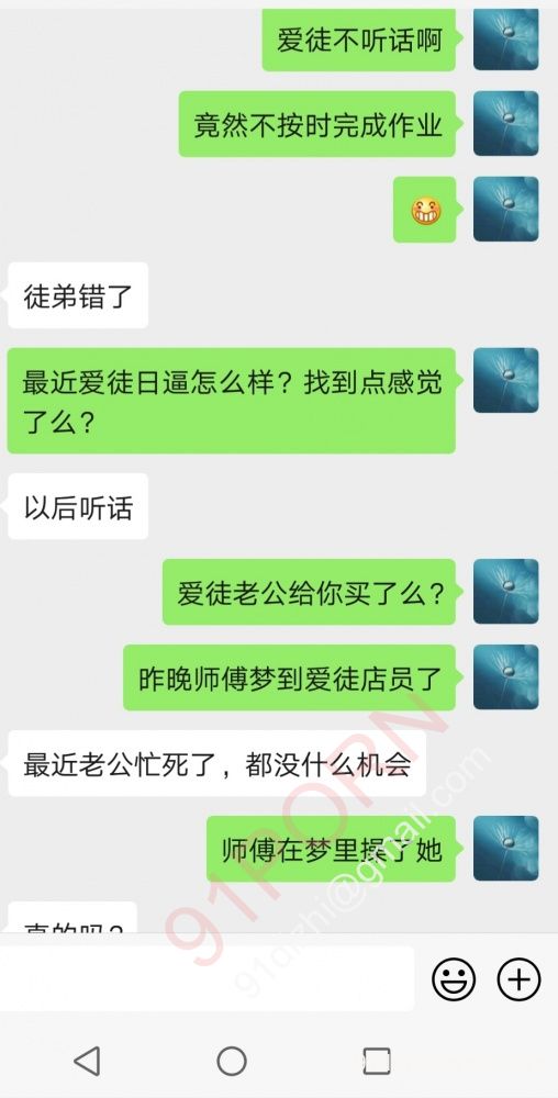 一开始对我有防备之心,慢慢了解得知其夫妻二人新鲜感已过,无法重燃爱之激情,给她分析了好多夫妻爱爱之事和性爱解放,这中年妇女40岁竟然主动称呼我为师傅。当时就觉得她奴性应该也非常强。时间有点久了很多聊天记录和图片都没了。